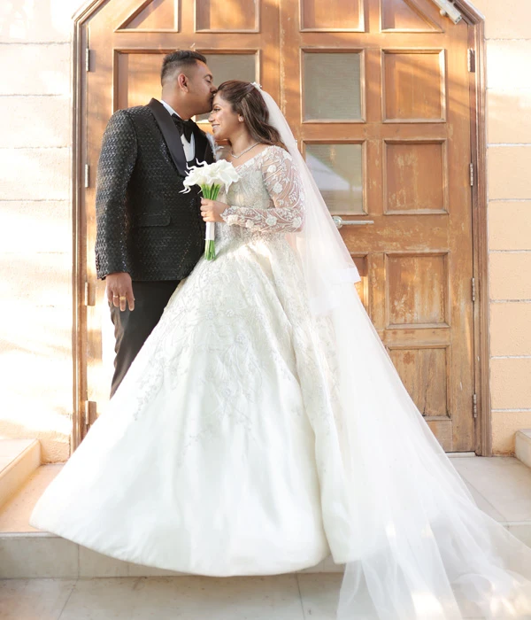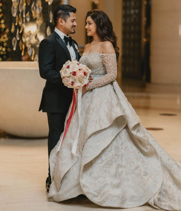 The exceptional handwork on this gown is a true celebration of refined craftsmanship. Embellished with shimmering glass beads and delicate, hand-sewn flowers, every detail is thoughtfully arranged to form an intricate yet elegant pattern. The precisely-set diamonds impart a radiant sparkle, reflecting light beautifully with every movement, ensuring you shine from every angle. The harmonious fusion of these opulent elements, from the glittering beads to the perfectly positioned diamonds, elevates this bridal gown to unparalleled grandeur. The outcome is a breathtaking creation that exudes sophistication and elegance, making it the ultimate designer gown for weddings where only the finest will suffice. Perfect for a bride who desires to captivate and glow on her special day.
