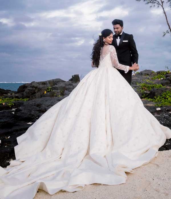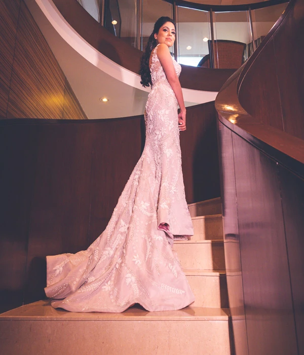 Indulge in the epitome of luxury and sophistication with this exquisite white mermaid gown—a masterpiece of elegance. Adorned with intricate hand embroidery, every stitch is interwoven with delicate glass beads, luminous pearls, and sparkling diamonds, creating a design that radiates opulence. The flattering neckline accentuates your natural beauty, while the gown’s sleek, figure-hugging silhouette flows effortlessly into a long, graceful train. Each detail, from the precise handwork to the carefully placed embellishments, is crafted with exceptional care, creating a stunning blend of modern glamour and timeless allure. Designed by a leading white wedding designer in India, this gown is perfect for any formal occasion where you wish to captivate and shine.