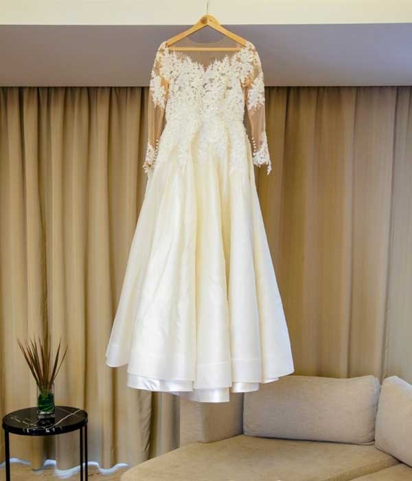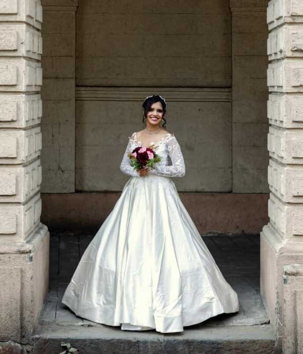 This exquisite gown, crafted from sumptuous tulle, embodies elegance and timeless charm. The delicate handwork, combined with intricate embroidery, adds a refined artistic touch to the design. Long sleeves create a classic and sophisticated silhouette, while the tulle fabric enhances the gown’s graceful drape and airy lightness. Every detail is meticulously executed, highlighting craftsmanship that ensures a polished and enduring look. Perfect for the bride who values exquisite details, this gown seamlessly blends traditional charm with contemporary sophistication, creating a stunning and unforgettable presence on your special day.