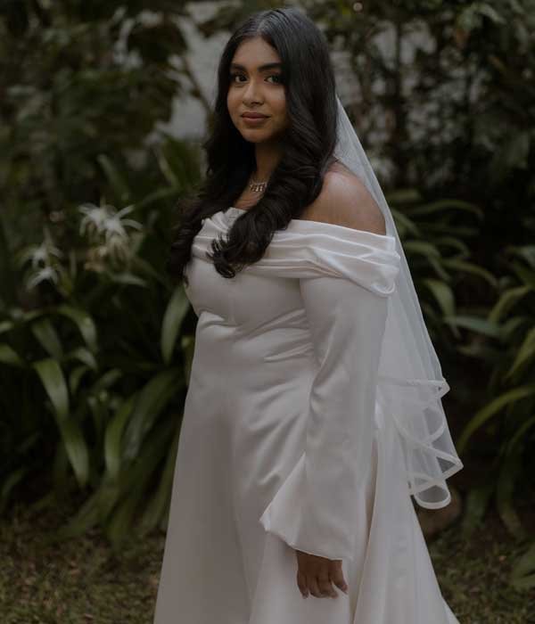 This gown embodies timeless elegance with its minimalist design and classic silhouette. The off-the-shoulder neckline adds a touch of sophistication, beautifully framing the collarbone and shoulders. The fitted bodice seamlessly transitions into a stunning A line skirt, creating a graceful and flowing movement. Perfect for the bride who appreciates understated beauty, this gown combines simple lines with redefined details like the flare sleeves to achieve a look that is classic, classy and effortlessly chic. Its timeless design ensures that you will radiate elegance on your special day, making it an ideal choice for a wedding that exudes pure sophistication.